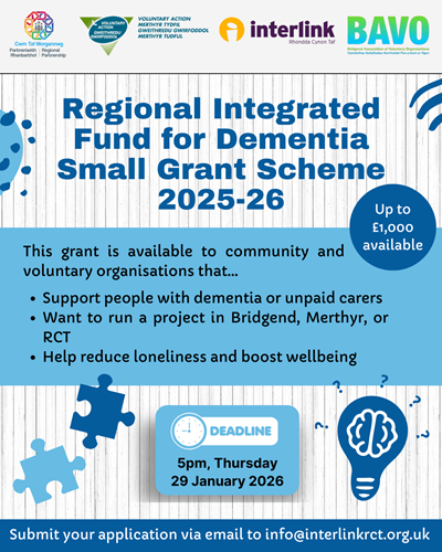 Applications are now open for small grants of £500–£1,000 to support people living with dementia and their unpaid carers or family members across Bridgend, Merthyr and RCT.