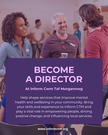 INFORM Cwm Taf Morgannwg is a service user-led Community Interest Company (CIC) passionate about improving mental health, wellbeing, and inclusion across Rhondda Cynon Taf, Merthyr Tydfil, Bridgend, and the wider South Wales region.